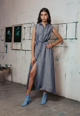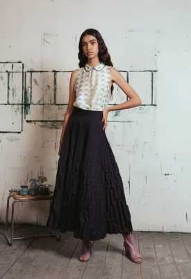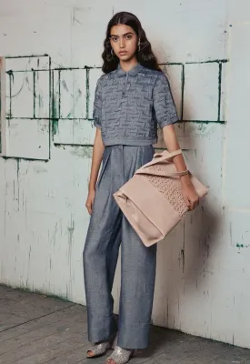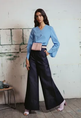 Il tessuto che ho usato maggiormente nella presente collezione è il Prince Blu 85, che si è rivelato un ottimo alleato nella realizzazione delle gonne a mezza ruota plissettate. Per alcune gonne, come quella a tubino, per ottenere un risultato più morbido ho usato anche l’Agata Shade. Infine, per i pantaloni, il trench, lo chemisier e alcune bluse ho usato il Berlino Blu e il Berlino 45: la composizione in misto lino di questo tessuto ha dato un ottima resa su una collezione primavera/estate, e mi ha aiutata a ottenere il mio obbiettivo, donando al denim quel sapore vagamente couture che stavo cercando.